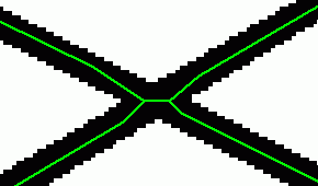 Max removed bridge length (pixels) is the maximum length of bridge between two neighboring polyline intersections. Such bridges will be deleted and the remaining polyline ends will be drawn together.